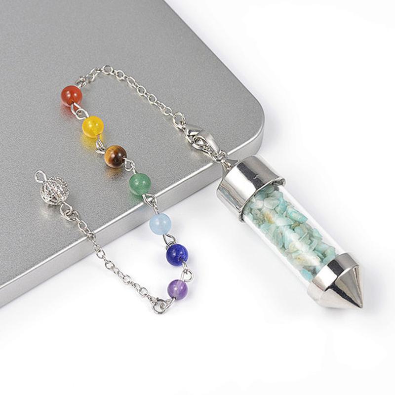 Péndulo de 7 chakras de 65 mm x 18 mm compuesto por 7 cuentas y un depósito que contiene mini piedras de amazonita enrolladas.