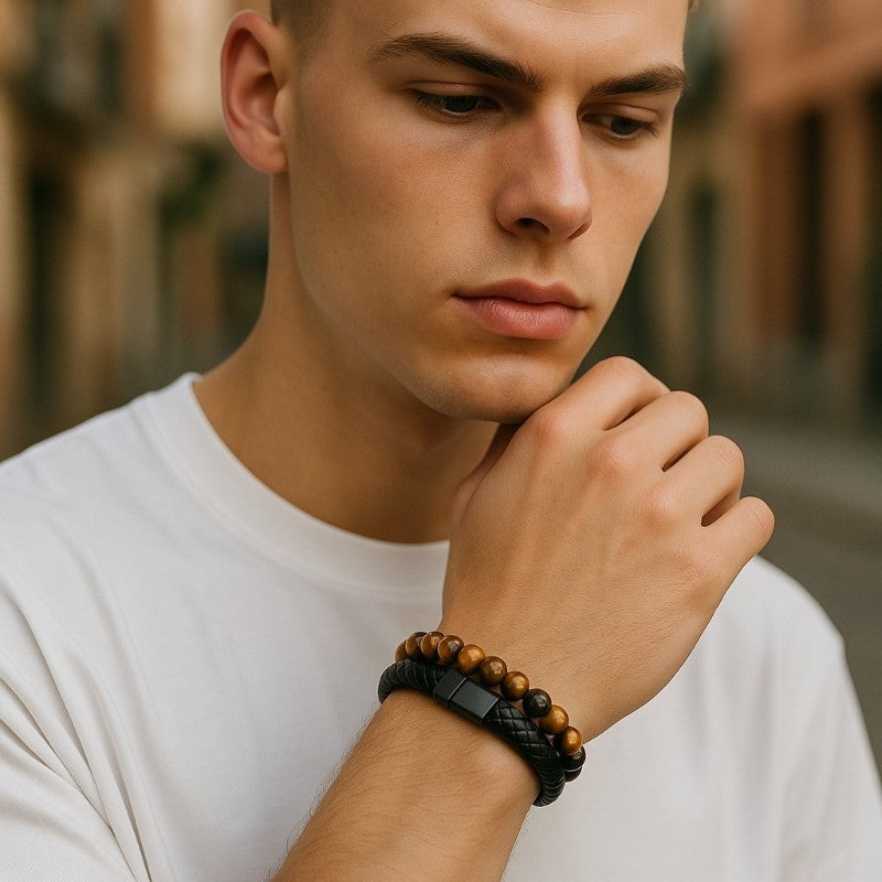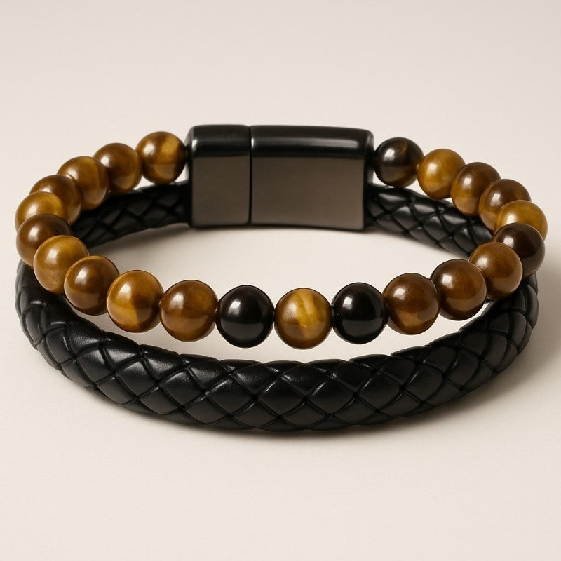 Men's bracelet in frosted onyx and lava stone leatherVendor:Men's bracelet in frosted onyx and lava stone leatherLa Boite à Cailloux- Regular price