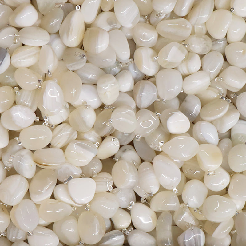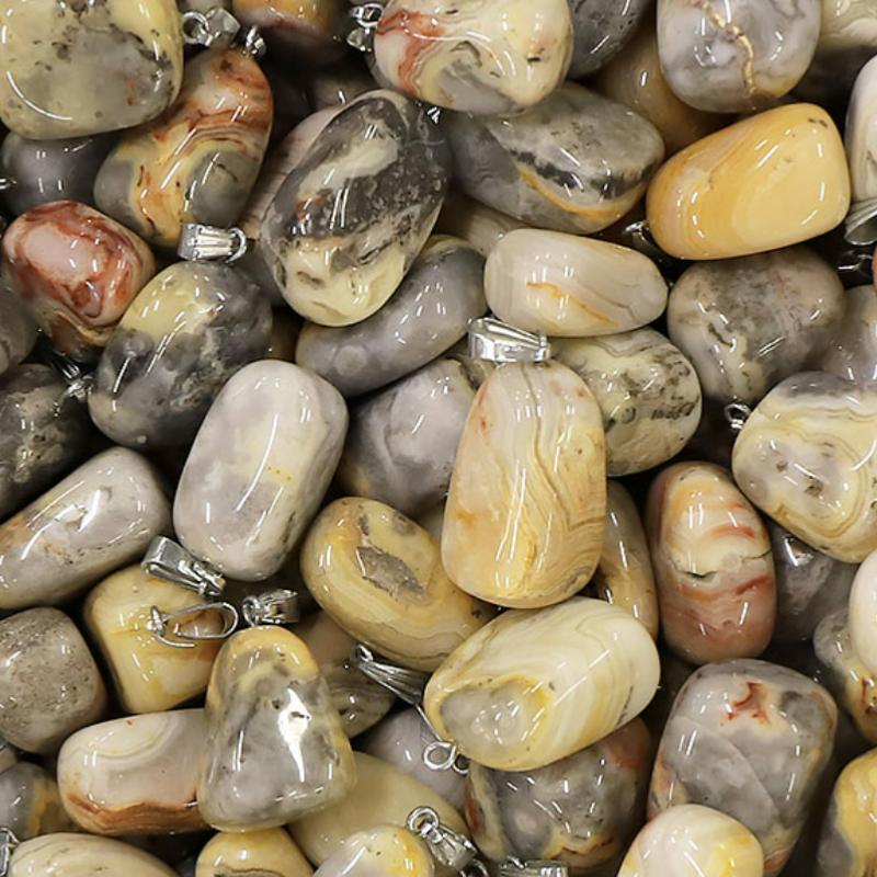 This range includes several hundred unique references handcrafted and composed of stones from all over the world. You will find both raw stone and tumbled stone pendants in various shapes. They come in the form of stones with holes or with bails (steel or silver). The cabochon can be round, oval, drop, square, rectangular, triangle, marquise, etc. Some are even faceted.