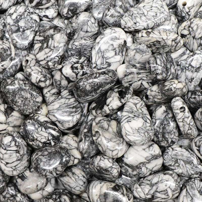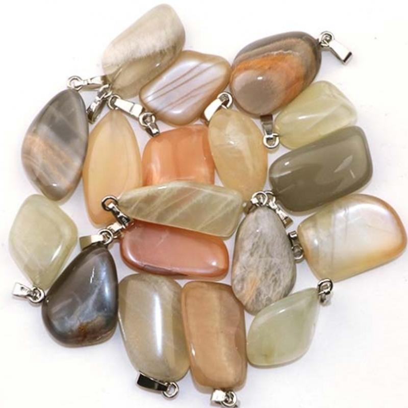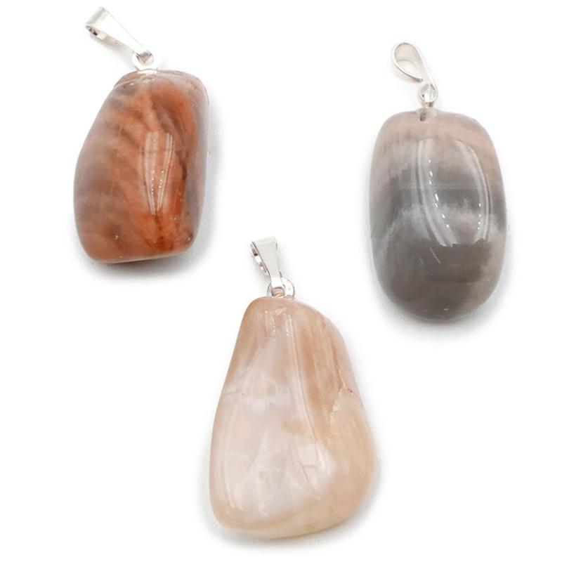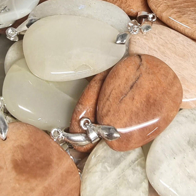 This range includes several hundred unique references handcrafted and composed of stones from all over the world. You will find both raw stone and tumbled stone pendants in various shapes. They come in the form of stones with holes or with bails (steel or silver). The cabochon can be round, oval, drop, square, rectangular, triangle, marquise, etc. Some are even faceted.