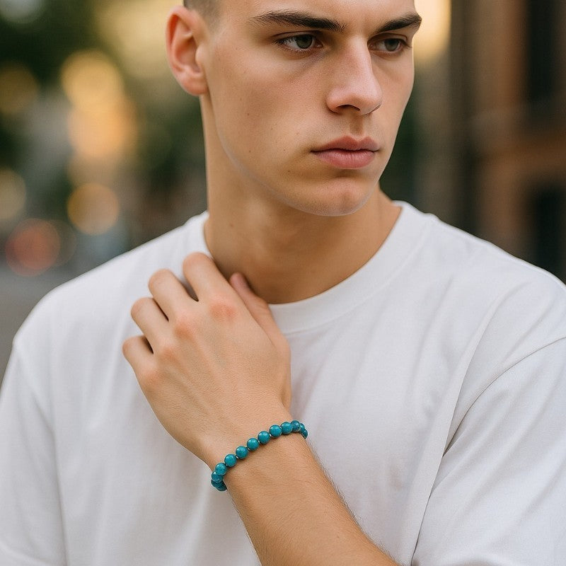This men's bracelet is made of 7-8mm A+ quality blue apatite beads from Madagascar.