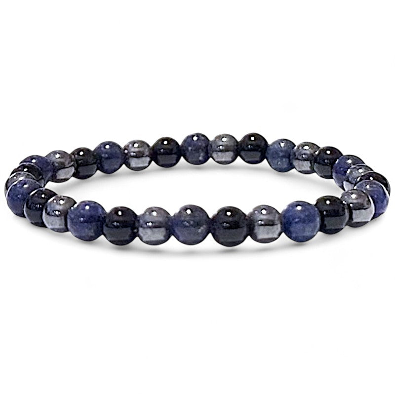 Elastic bracelet made of heated and dyed lapis lazuli, hematite and onyx beads of 5-6mm.