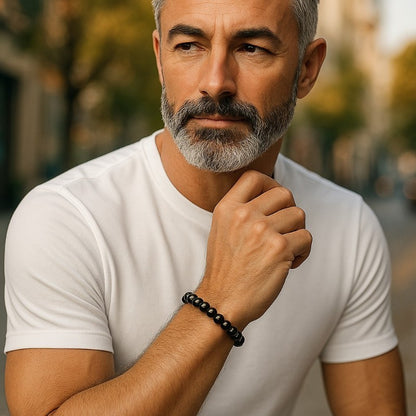 This men's bracelet is made of Brazilian A-grade black tourmaline beads, measuring between 7 and 8 mm. Known for its protective properties, this piece of jewelry combines elegance and well-being. Its size L ensures a comfortable fit for everyday wear, ideal for those looking for an accessory that is both aesthetically pleasing and beneficial.