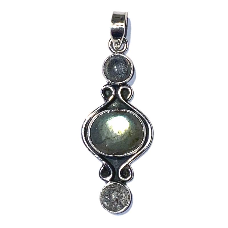 925 silver pendant composed of 3 labradorite cabochons: 2 of 6x6mm, 1 of 10x12mm.