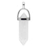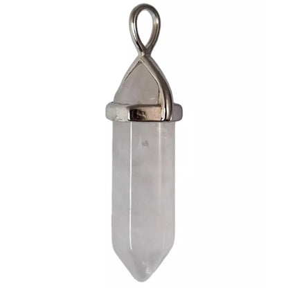 Double-terminated rock crystal point approximately 38mm x 12mm on stainless steel stand.