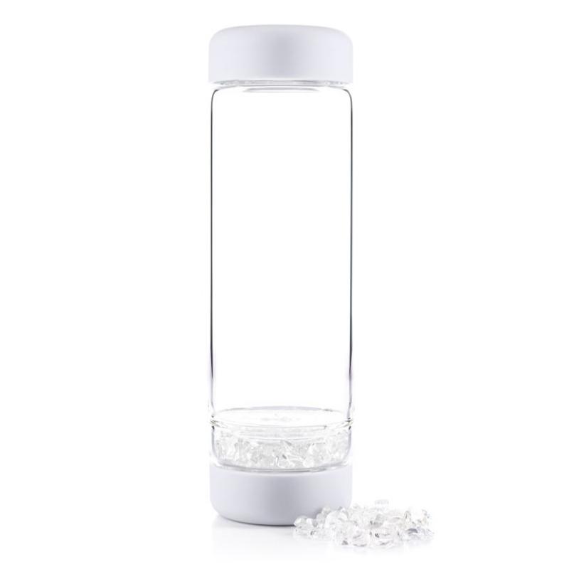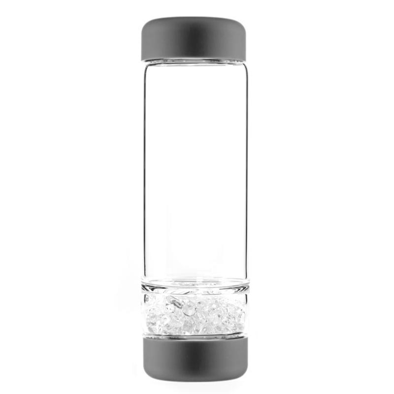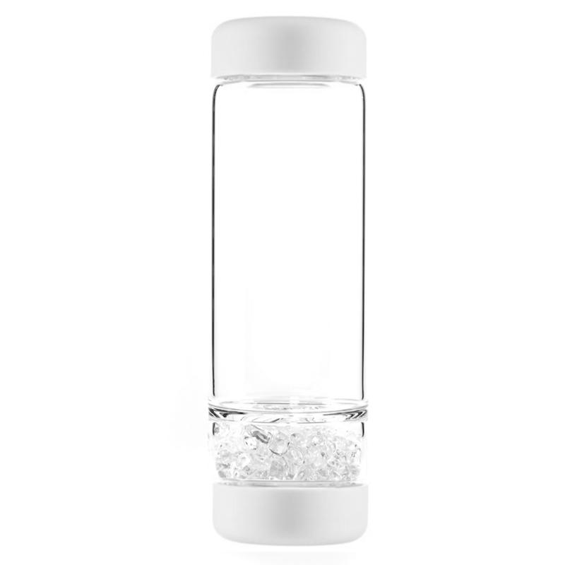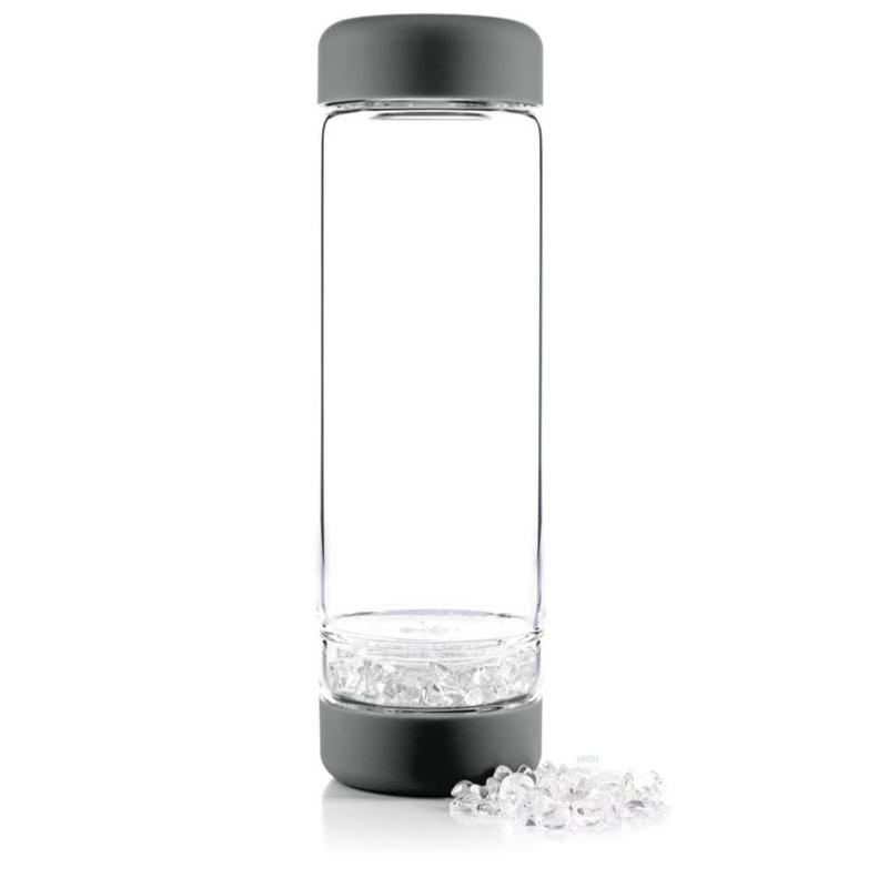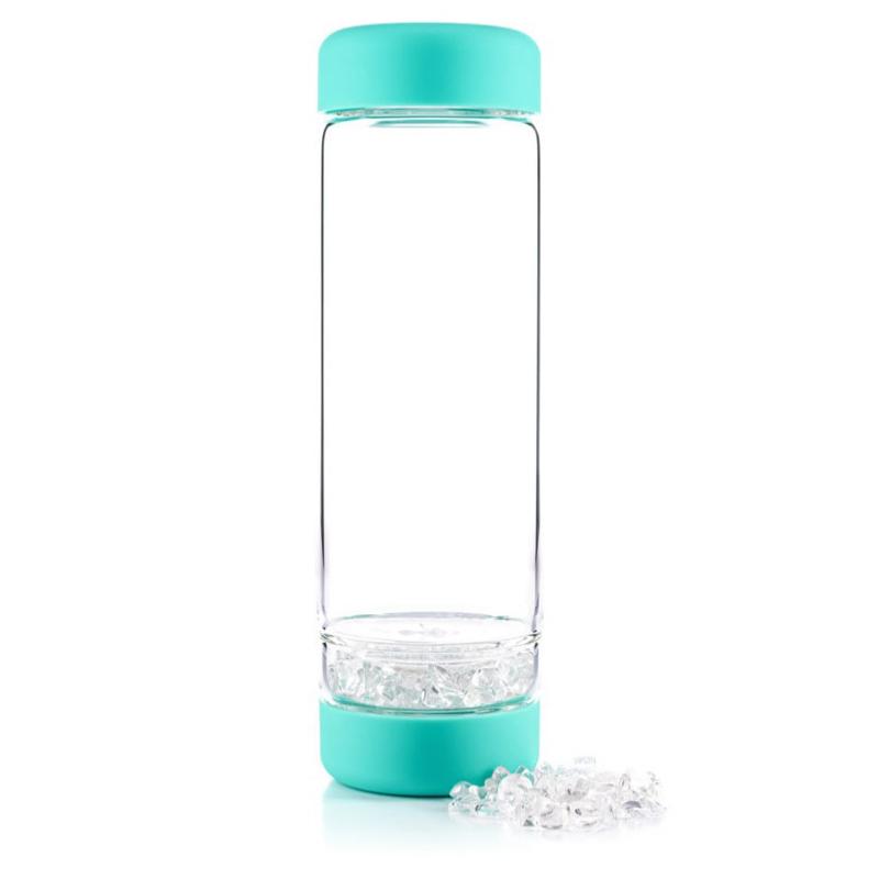 inú! [Hawaiano: "¡Bebe!"] Es una botella de agua de vidrio extra resistente con una cámara separada, llena hasta el borde con cristal de roca cuidadosamente seleccionado.