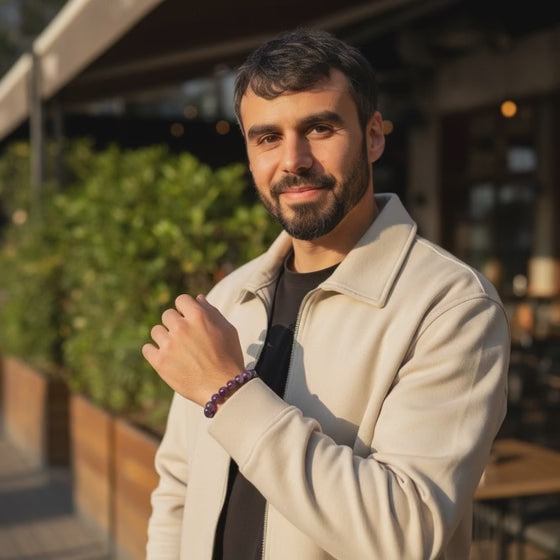 Esta pulsera para hombre está hecha de cuentas de amatista natural de 7-8 mm de Brasil.