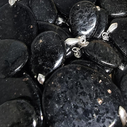 Piedra plana de coppernita (nuummita india) de aproximadamente 30-35 mm con asa de acero.