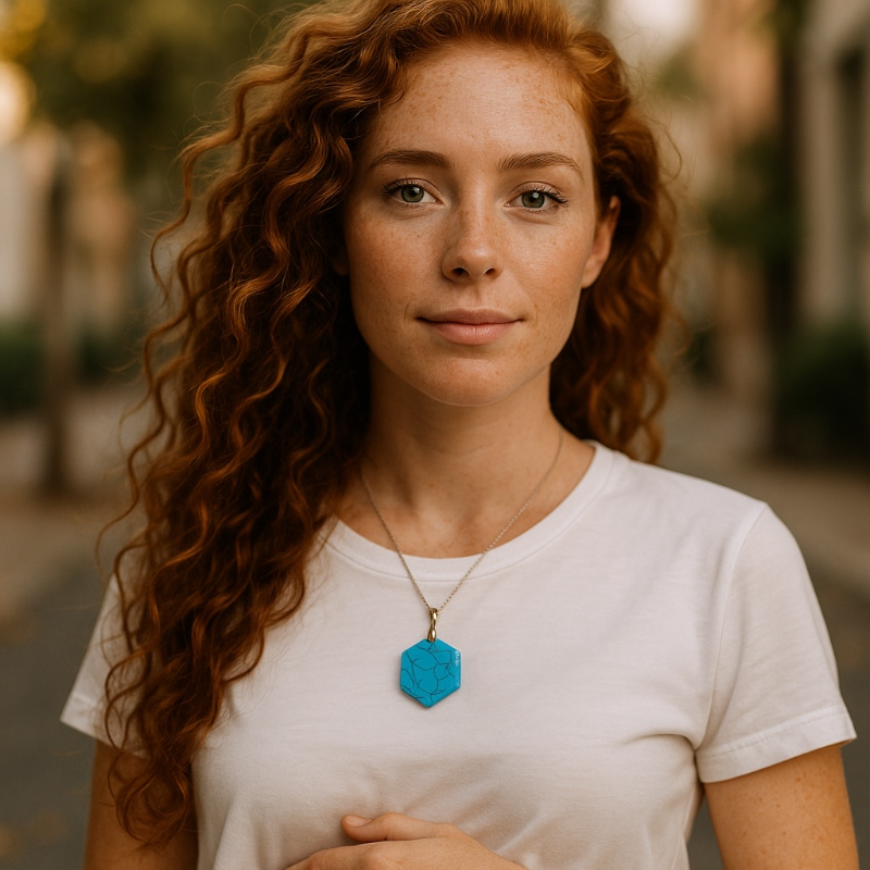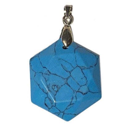Sello de Salomón en turquesa, de aproximadamente 25 mm de tamaño, perforado por un asa de latón plateado.