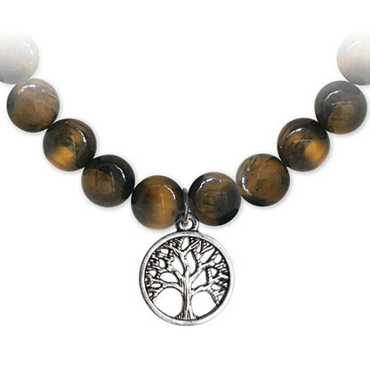 Bracelet composé de boules d'oeil de tigre de 7-8mm et d'un arbre de vie en acier inoxydable.