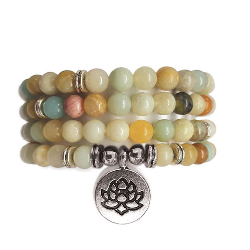 Chaque bracelet/sautoir se compose de 108 perles minérales, de perles en métal argenté et d’un charm’s Fleur de Lotus.