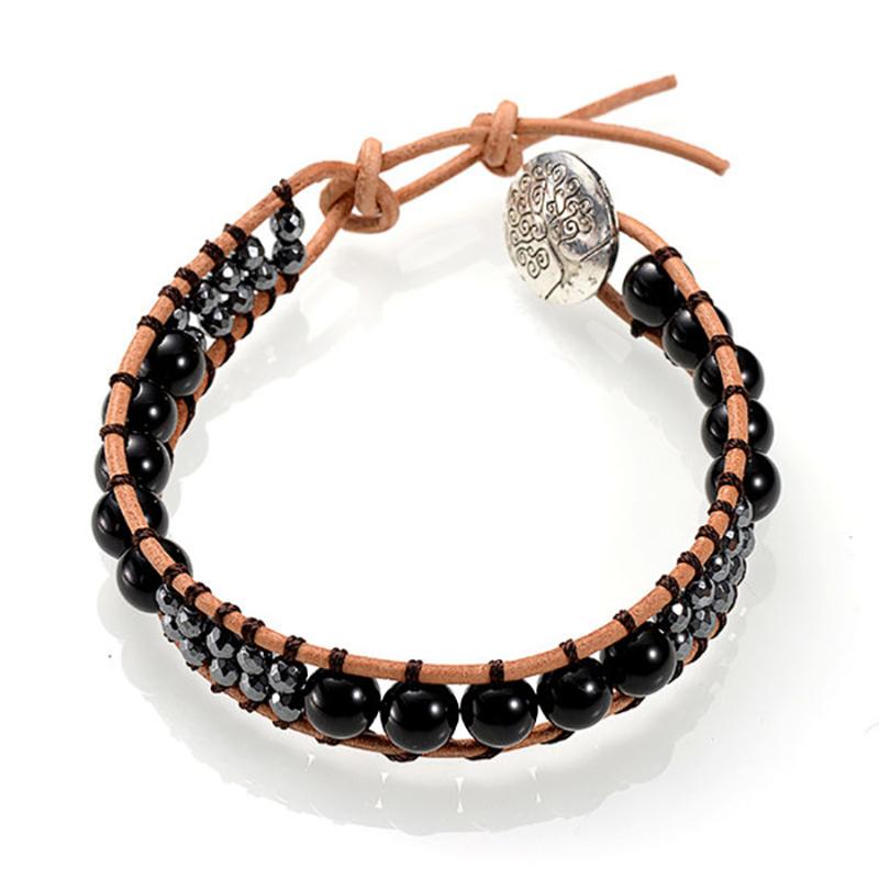 Bracelet cuir mixte onyx (boules 7-8mm)