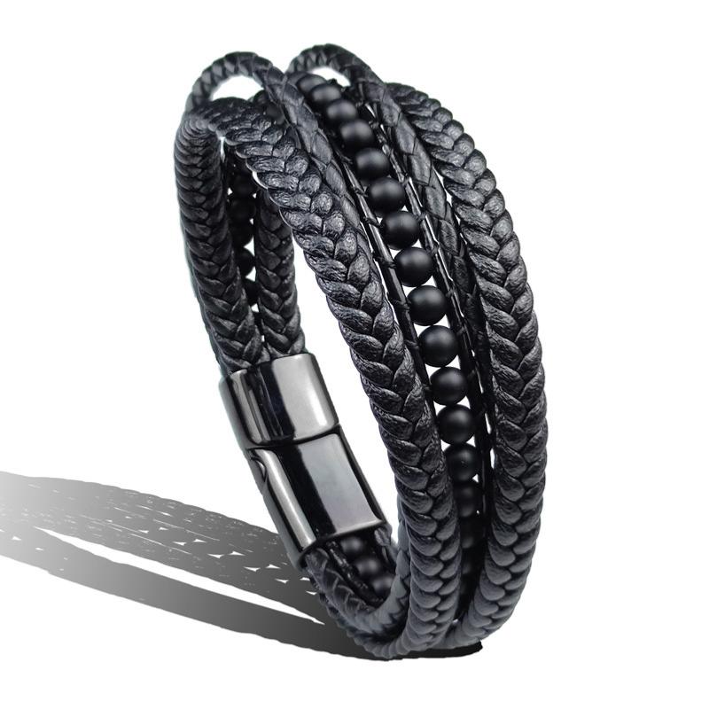 Bracelet Homme cuir onyx dépoli (boules 3-4mm)