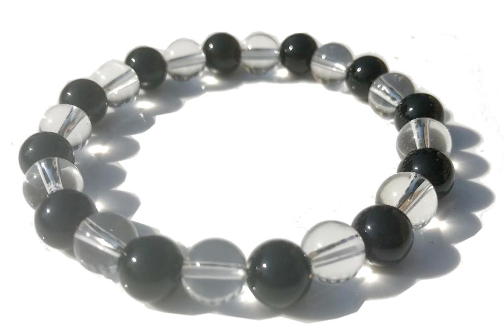 Très beau bracelet élastique composé de boules de 7-8mm d'onyx et cristal de roche