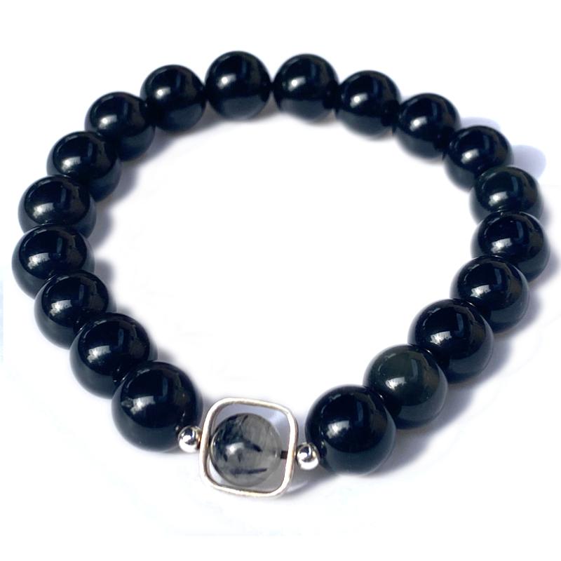 Bracelet obsidienne oeil céleste + quartz tourmaline boules 10mm