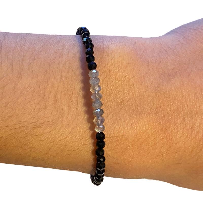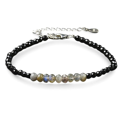 Très beau bracelet composé de perles facettées d'onyx et labradorite de 2-3mm.