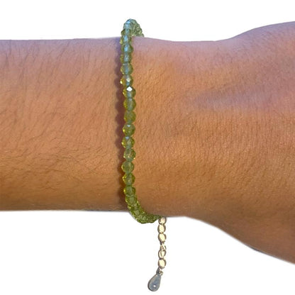 Ce bracelet est fait avec des perles facettées de qualité AA de péridot d'Inde, montées sur une chaîne en argent 925. Offrez-vous un accessoire élégant et naturel, apportant une énergie positive et aidant à soulager le stress et l'anxiété. Parfait pour compléter votre look avec une touche de bien-être.