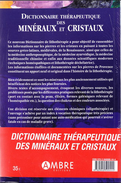 Ce nouveau Dictionnaire de lithothérapie a pour objectif de rassembler les informations sur les pierres et les cristaux en puisant à toutes les sources gréco-latines, médiévales, de la Renaissance, ainsi que celles de la médecine anthroposophique, de la médecine ayurvédique, la médecine traditionnelle chinoise et enfin aux données scientifiques modernes (techniques homéopathiques et lithothérapie déchélatrice).