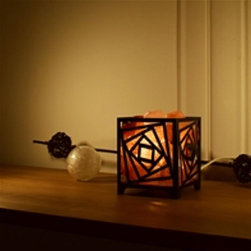 La lumière saline donne une lumière jaune orangée chaude et agréable et le beau motif de formations carrées dans le panier ressort vers l'extérieur de la lampe.