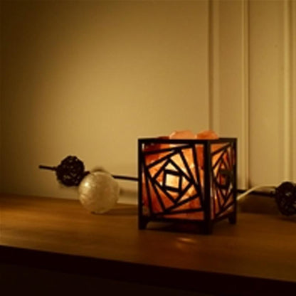 Très belle lampe à sel dans un panier en métal avec un design carré mesurant environ 15 cm de haut.