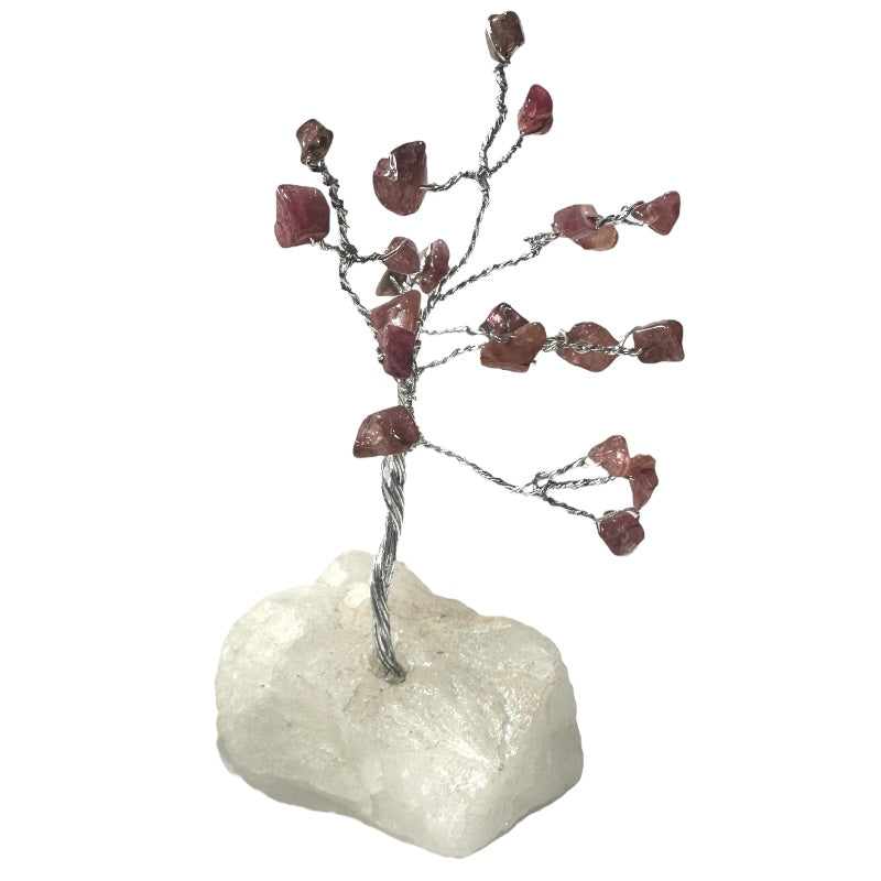 Petit arbre du bonheur composé de petits morceaux de tourmaline rose (rubélite) sur druze de Cristal de roche.