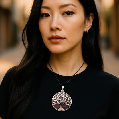Pendentif arbre de vie en acier inoxydable enfermant une améthyste 'environ 30mm.