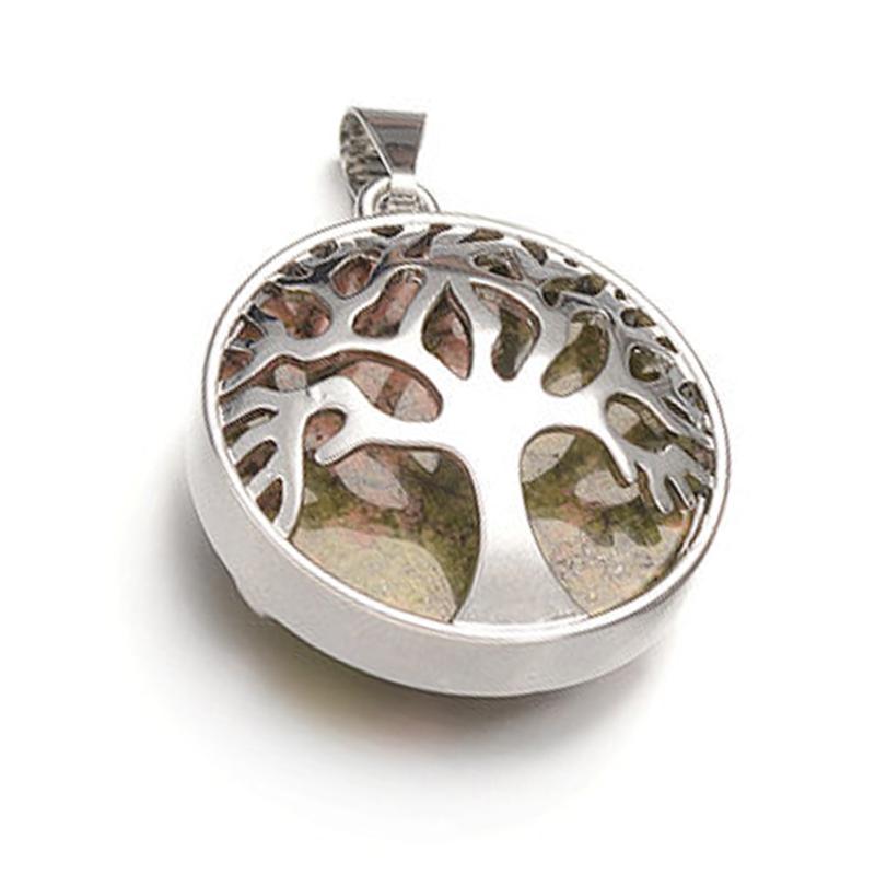 Pendentif arbre de vie en acier inoxydable enfermant une unakite d'environ 27mm.
