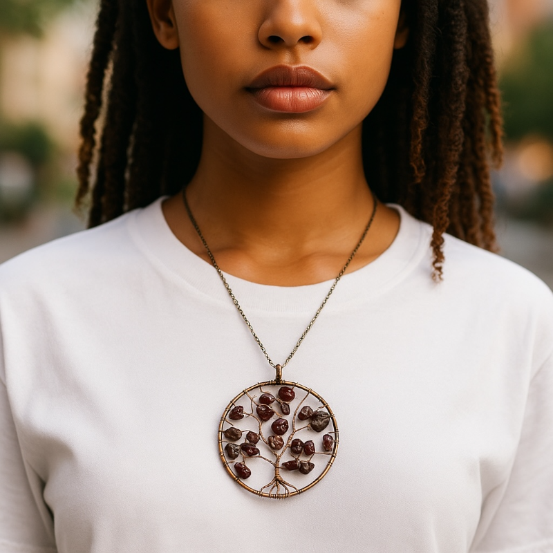 Pendentif arbre de vie en acier cuivré de 50mm avec de petits fragments de grenat rouge almandin