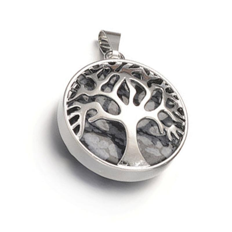 Pendentif arbre de vie en acier inoxydable enfermant une obsidienne neige d'environ 27mm.