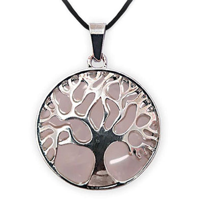 Pendentif arbre de vie en acier inoxydable enfermant un quartz rose d'environ 30mm.