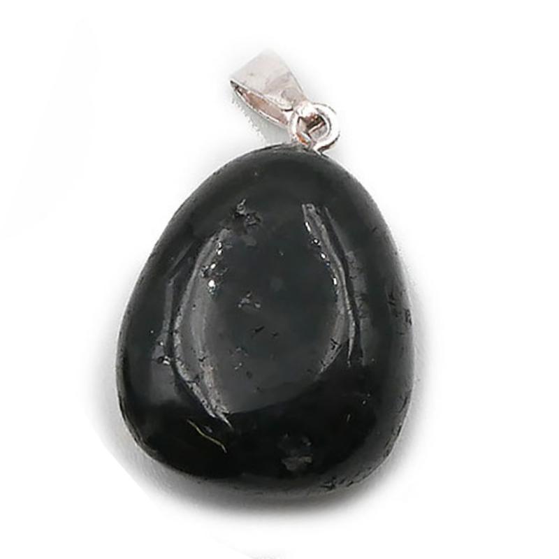 Pierre roulée d'astrophyllite d'environ 25-30mm avec bélière en acier.