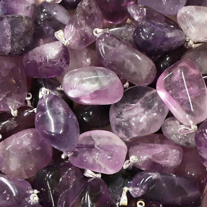 Pierre roulée de fluorine violette d'environ 20-25mm (peut légèrement varier) percée par un une bélière en acier.