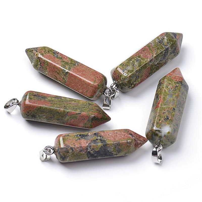 Pendentif composé d'un prisme d'unakite de 45mm avec bélière en acier.