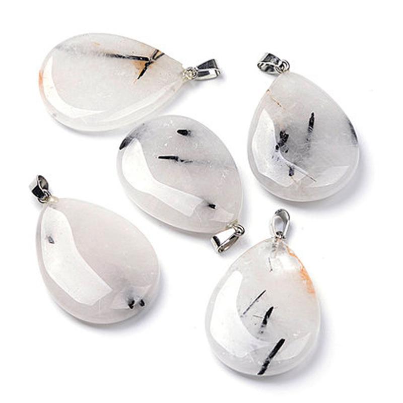 Pendentif composé d'un cabochon de quartz avec inclusions de tourmaline en forme de goutte d'environ 40mm x 30mm avec une bélière en acier inoxydable.