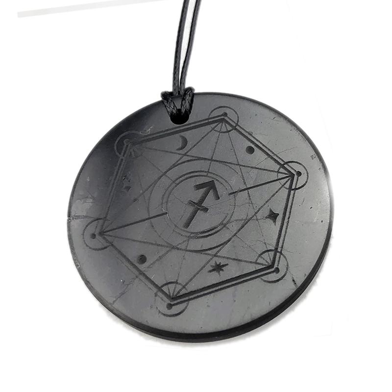 Pendentif rond de 45mm en shungite gravé avec le symbole du Sagittaire