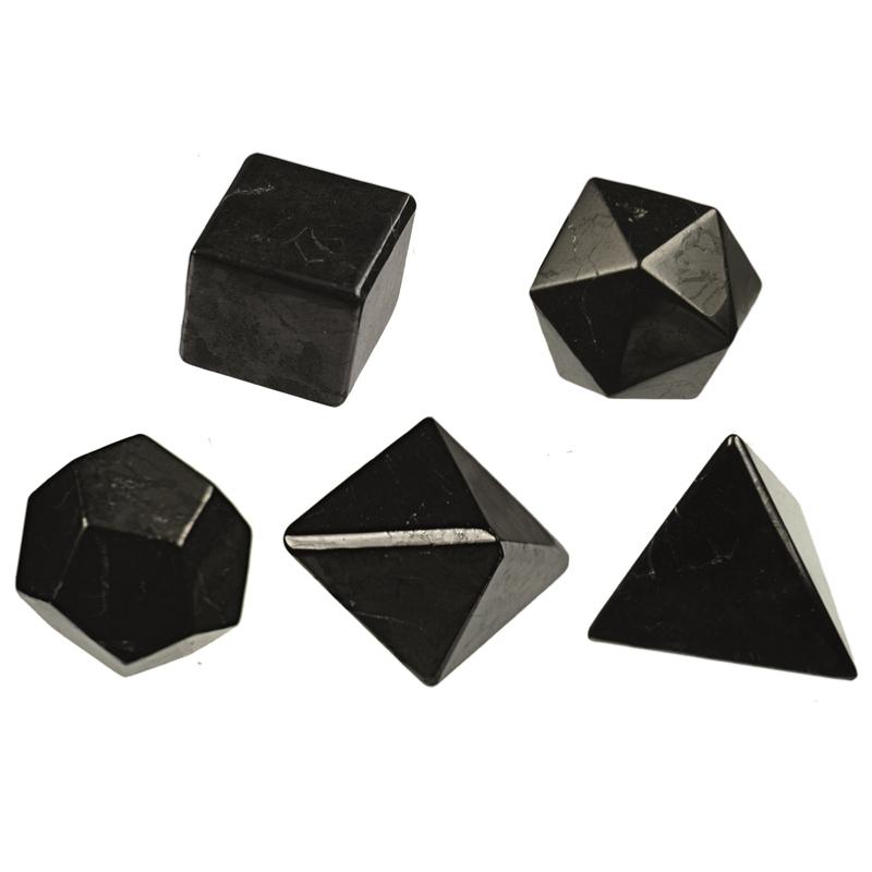 L'ensemble se compose des 5 solides de Platon en shungite d'environ 2,5 cm de diamètre et une explication en français, le tout, livré dans une boîte cadeau.
